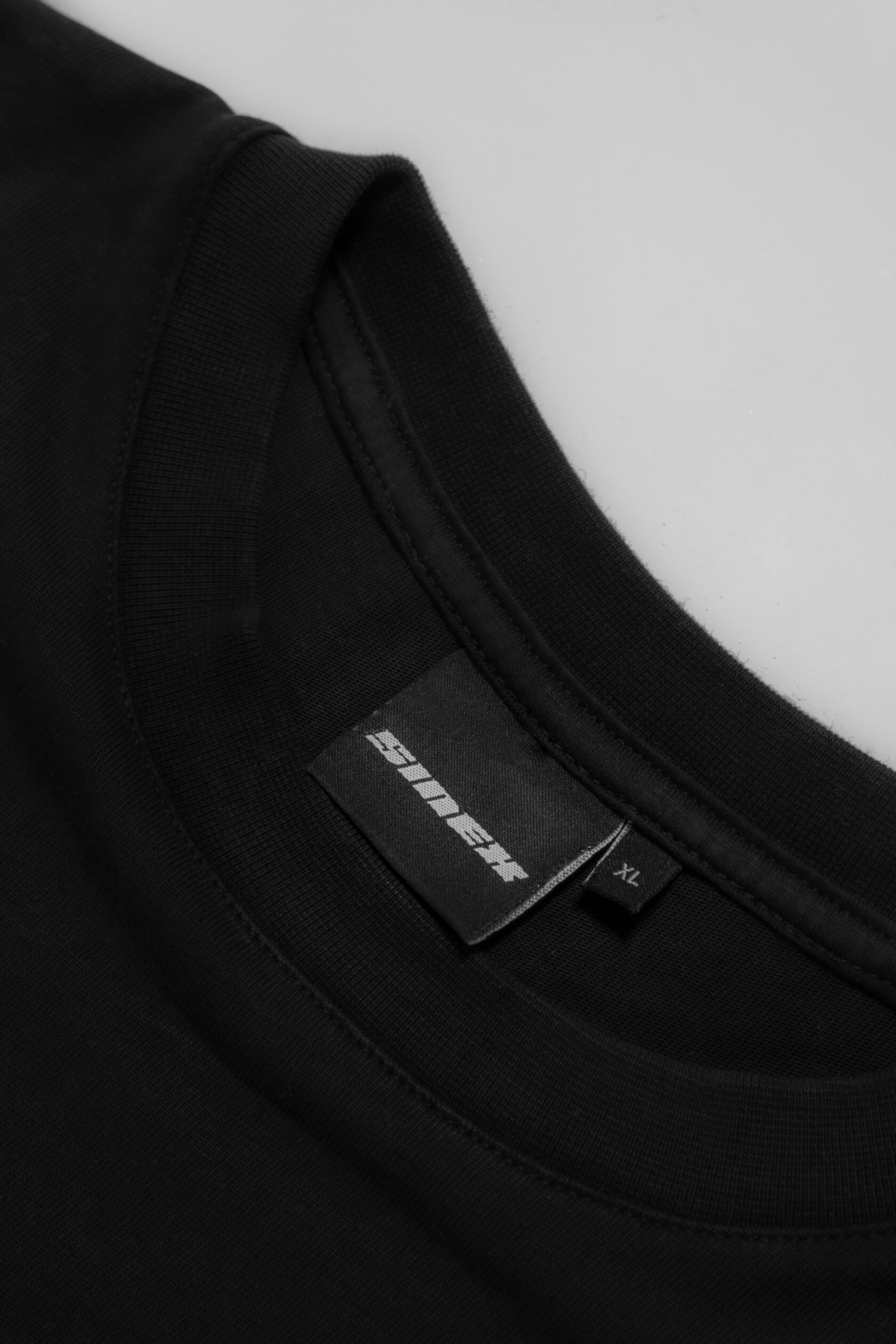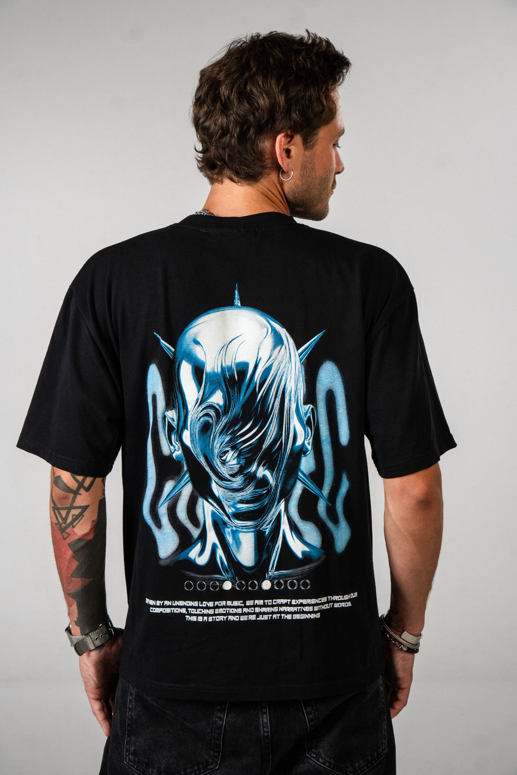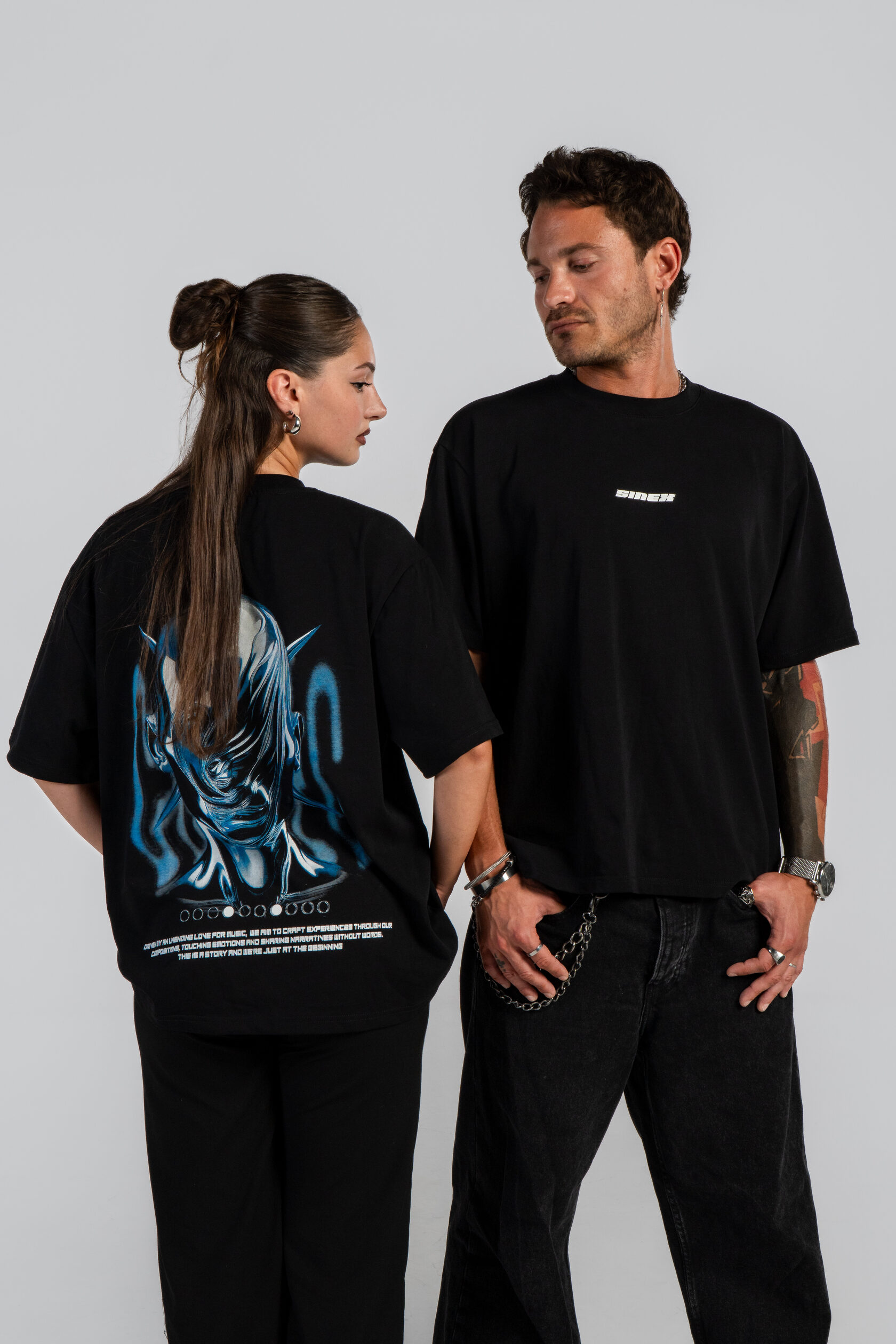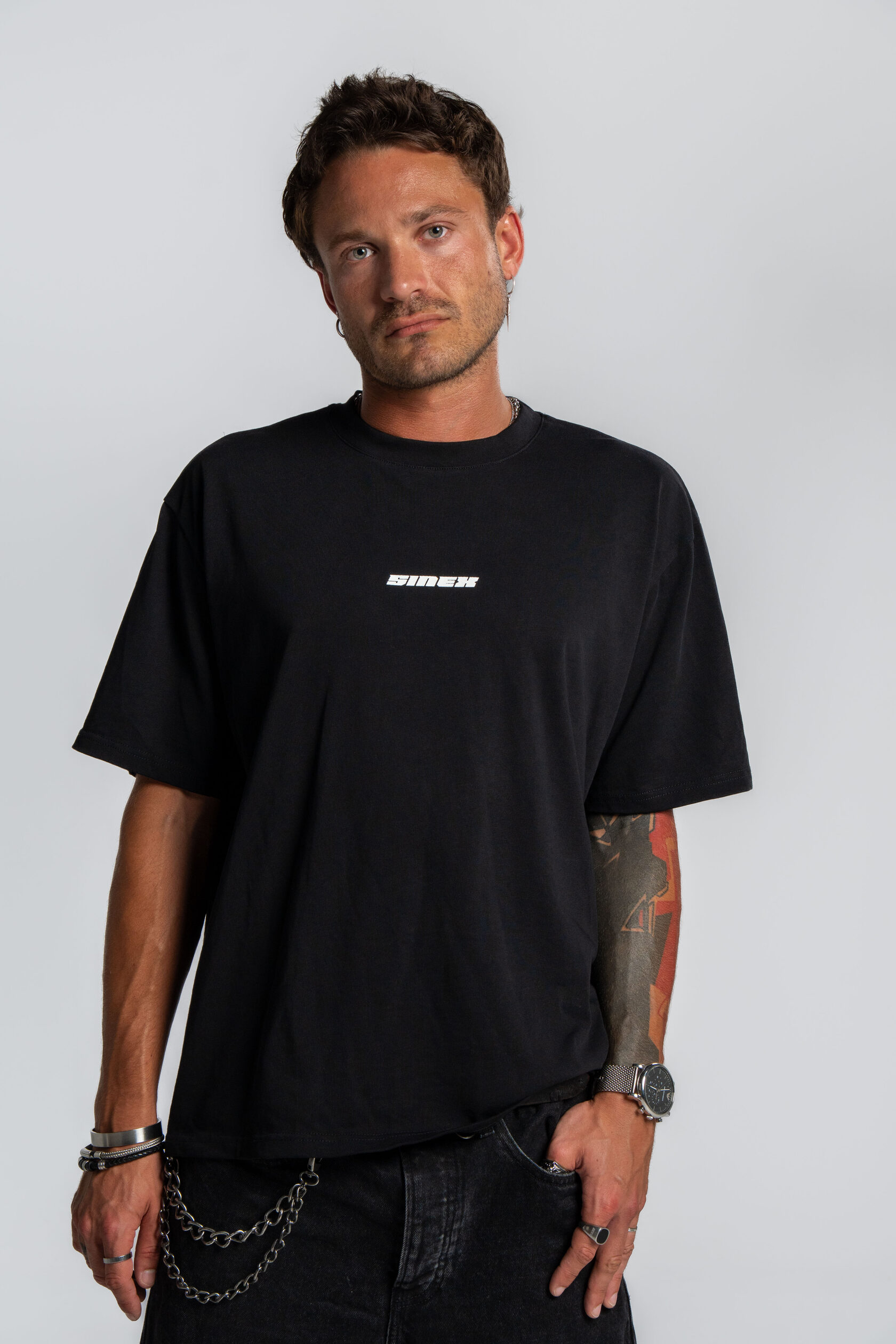 Lieferzeit: 14 Tage SINEX Graphic Tee in Schwarz: Boxy-Fit T-Shirt aus 250 GSM, 100 % Baumwolle. Vorn kleines SINEX-Logo, hinten großformatiger Artwork-Print. Das linke Model trägt Größe S, das rechte M. Entstanden beim in Freiburg gegründeten Label SINEX von Contec, der Design, Shooting und Projektleitung verantwortet hat. Pflege: auf links bei 30 °C waschen, nicht trocknen, nicht über den Print bügeln.